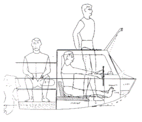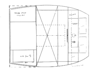 So, a few of us toyed with an idea. DiN will sleep two if you can squeeze into a 3ft berth. There is a galley/nav station desk with storage lockers. The boat may be steered from inside the cabin or from the cockpit. In both positions, you may control the boat seated or standing. The 6ft seat/berth allows you to shift your position (one person or two) to trim ship. (Important on so small a boat!) A large hatch in two parts allows plenty of room to stand as you enter or leave the boat and to stand and steer. In order to keep the cabin low enough to see over from the cockpit, you sit in a race car position.