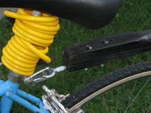 eyebolt that swivels, and which engages a snap-hook bolted to the bicycle seat post. The swivelling eyebolt in the turnbuckle allows the bicycle to be horizontal while the canoe and dolly remain vertical.
