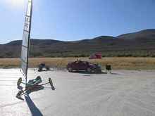 The days alternated between big winds and nearly no wind, with the light air days providing ample opportunity to stroll up and down the line, kicking tires and bullshitting with the owners (and often builders) of these intriguing machines. A fabulous group of guys and gals, ever willing to share sailing and technical tips, and encourage the newbie. A puff would come through, and the desperate among us would push our craft onto the playa as fast as we could run, jump aboard, and milk the zephyr for all it was worth, and then ignominiously drag the boat back to the edge when it fizzled, break open another beer, and resume the discussions.