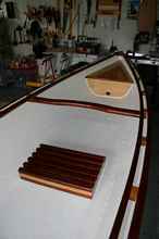 I fitted the buoyancy tanks which I think look quite nice. I have been told that an inverted canoe sits very low in the water and buoyancy tanks make it more manageable. I look forward to inverting it to find out! I designed my own seat and added the broken inwales which really enhance the design. I used International Interdeck inside as a non-slip medium. Anyway it doesn't look too bad for a first go built from scratch. My varnishing skills are improving, hopefully the same can be said for my methods of stitch and glue. Next time I will try using scarf joints. I was fascinated to watch my rollers start to smoke as I applied the epoxy on a warm day! I thought I had been working too hard.