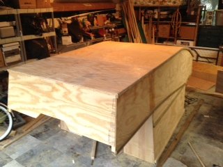 Your epoxy worked perfectly - thanks for a good product. My Kokeemo is progressing nicely for someone who is not using any blueprints - none. I finished the bottom, chimes and corners last week. We had two weeks of 80 degree weather in SW Florida- I guess that was perfect for a slowpoke like me to do his first epoxy/fiberglass layup. I have used 2 sheets of 1/4" plywood and three sheets of 1/2" plywood. I will need to buy only one more sheet of plywood to finish. The hull is hard to explain - 2 -29" x 96" pieces long ways with a keelson board down the middle to join it, and a 30" wide piece crossways at the cockpit end. I have a three way joint right at the rear cabin wall. I have a slight vee bottom 3/4" from center to sides and it tapers to a flat bottom at the rear of the cockpit. I don't know If anyone has ever done this before. A flat sheet of material has less strength than one that is bent or angled. This should eliminate a lot of bottom flexing - I still have to epoxy some bottom runners on later. Here are the update pictures. I am using some black tape to better show the joints on the plywood.