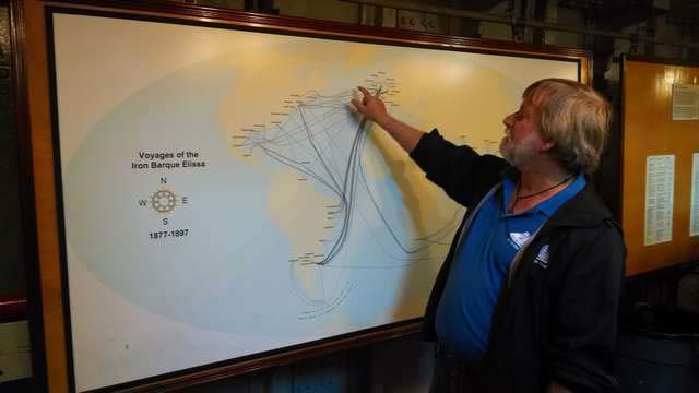 Below decks in what was the cargo hold, is an onboard museum which includes the map of all Elissa's voyages. |