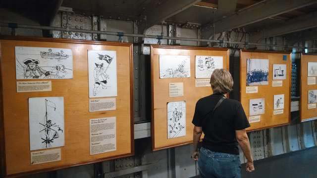 Up the gangplank, onto the ship we go. The foredeck is roped off to tours, but Jamie takes us through. Just inside the Forecastle is the crew cabin, a tight little space with narrow bunks and thin mattresses. A hatch in the floor is unlocked, and we squeeze down a narrow ladder into the bowels of the boat. The first of many fans is running, battling the damp that in this environment will always be waiting. We can see the inside of the hull, rivets and welds, patches and pieces. Not sure I would want to be down here when underway!