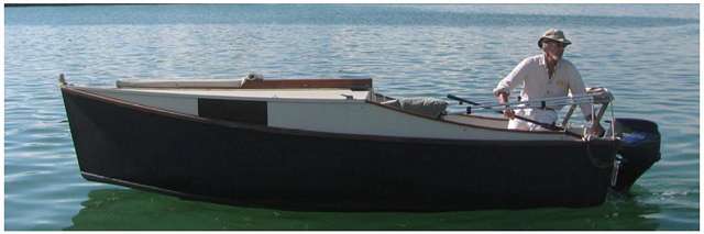 Kiss of the Wolf* was built in 2008 in a Nazareth, PA backyard. She is a fifteen and a half foot, outboard-powered, flat-bottomed skiff in the Sharpy style to lines drawn by boat architect Jim Michalak (AF4b).