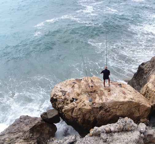 Man fishing from the rocky cliffs overlooking the Med near La Specia.