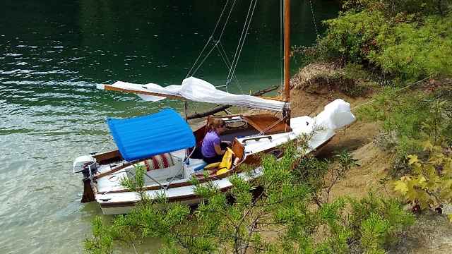 On the way to Mill Creek Falls I noticed a promising deep cove that I decided to explore for a good stopping place for an afternoon swim. I found a wonderfully sloping rock perfect for my shallow draft boat complete with a stone place for stepping off the boat dry footed. My wife found a “spa bench” at a perfect height in the water for a relaxing soak. The high bank above my impromptu boat slip had some man-made steps leading to a flat topped peninsula with signs of a campfire and, sadly, some bits of food trash. Evidently, some stealth camping goes on especially at such a secluded spot out of view of the rest of the lake. We were so relaxed that we decided to just stay the night in this secluded spot so cleaned it up a bit and relaxed. About sunset we witnessed a parade of boats heading back down the lake to the state park then the lake got really quiet except for the sounds of nature around us. If there hadn’t been some light clouds in the sky, I am sure we would have been treated to a wonderful tapestry of stars. Dinner consisted of reheating some pre-made chili and as the night cooled we got situated for our first night sharing the small cabin on this fourteen foot boat. Before turning it, I noticed the boat was becoming rather hard aground and at an angle so, with my wife’s help, I backed her down the slope a bit but kept a good portion of the bow grounded. The night passed swiftly with both of us being surprisingly comfortable in the small confines probably due to the cabin splitting centerboard trunk.