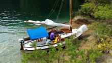 In July my family camped at Devil’s Fork State Park on Lake Jocasee in South Carolina. This state park offers the only public access to this 7,500 acre mountain lake situated 2 hours 30 minutes away from our house in Kennesaw. We brought some kayaks and did some exploring of the lake finding the clarity of the water incredible and enjoying its cool temperatures despite the 99 degree day. However, we were disappointed that the more mountainous parts of the lake, complete with beautiful waterfalls falling directly into the lake, were too far away to paddle to or even for the small electric trolling motor I had along. I vowed to make it back to the lake with my 14’ homebuilt sailboat for an overnight cruise.