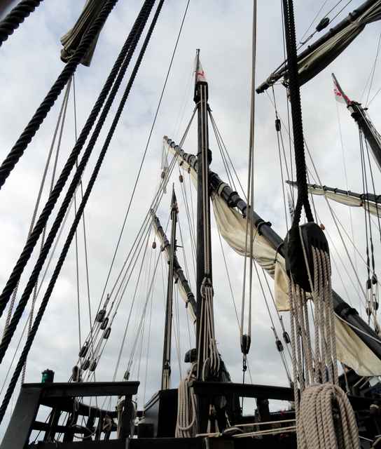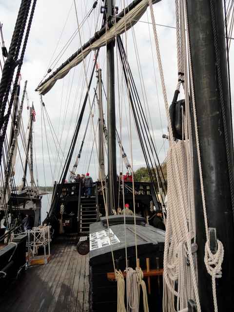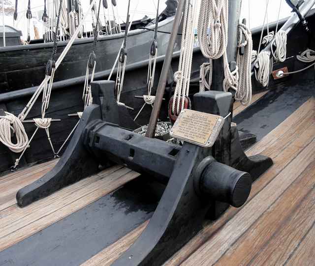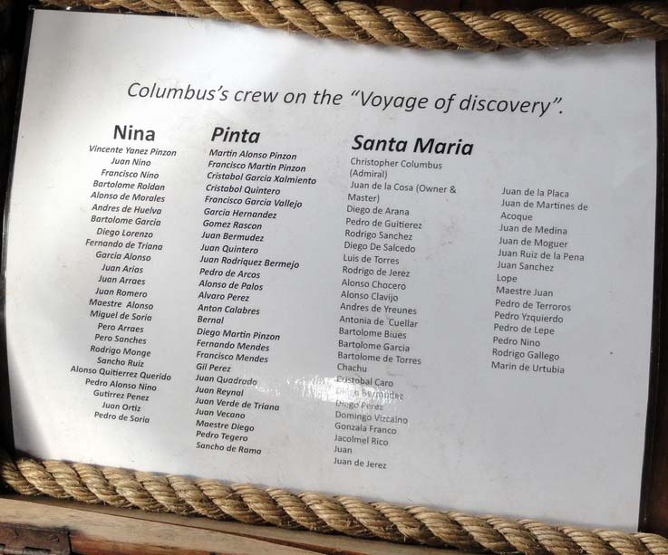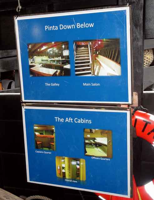 Looking around the boat, a lot of smart choices have been made. While the setup is traditional, the sails, for example, are modern Dacron fabric. Most of the ropes appear to be three-strand Dacron, which look the part but cut down the maintenance. A wood-stocked fisherman-style anchor is on the gunnel on the foredeck. Tucked discretely under the rail below it is a black-painted Danforth type. There are unobtrusive wire stays, parcelled and served, holding up the mainmast. Pictures, posters and exhibits are sensibly placed around the ships to help explain its history and workings and the way of life. And a small ships store is tucked into Pinta's covered stern deck.