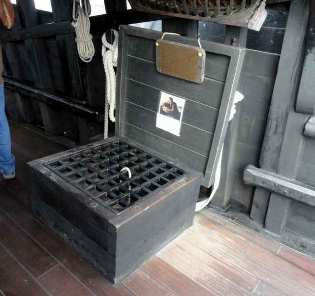 The captain did merit a private cabin, the only such accommodations on board. It was under the covered stern deck and had a whopping four feet of headroom. The entry hatch is reminiscent of a brig.